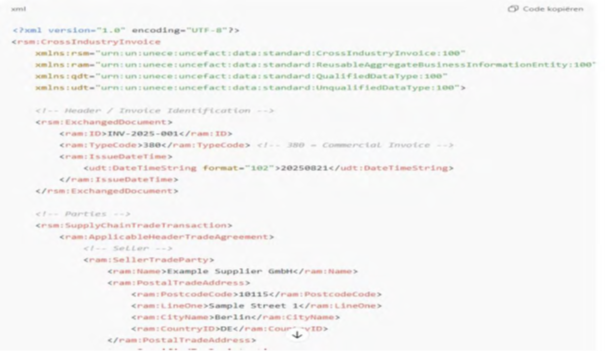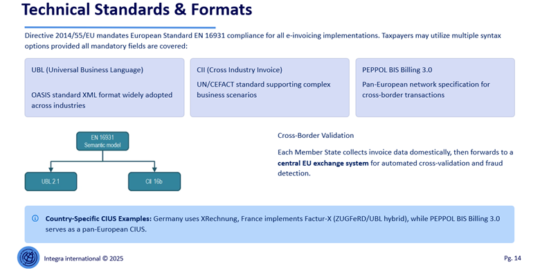 Technically, ViDA does not impose a single syntactic format but mandates compliance with the EN 16931 semantic standard. Multiple syntaxes are permitted, including Universal Business Language (UBL), Cross Industry Invoice (CII) and PEPPOL BIS Billing 3.0, provided that all mandatory data elements defined by the European standard are present. This reflects the EU’s regulatory approach of semantic harmonisation combined with technical pluralism, allowing interoperability without imposing a single technological architecture. Cross-border validation is achieved through a decentralised collection model, in which Member States collect invoice data domestically and forward structured data to a central EU exchange system for automated cross-border matching and fraud detection