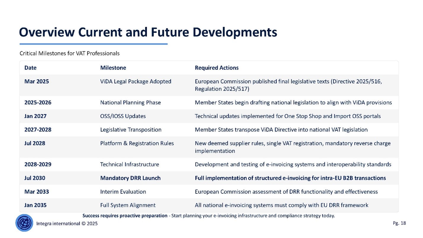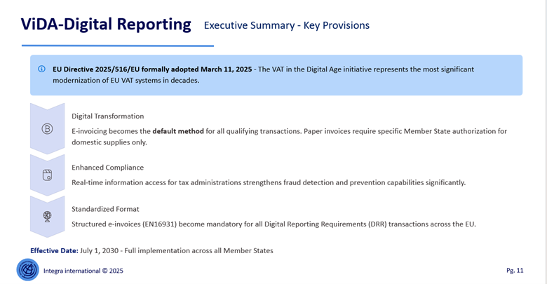 ViDA also aligns EU VAT compliance with global e‑invoicing developments, particularly in jurisdictions that have already implemented real‑time reporting systems (e.g. Latin America). This positions the EU within a global shift towards continuous transaction controls (CTC models).