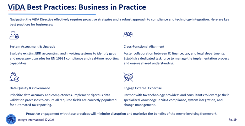 To succeed under the ViDA framework, businesses should treat e-invoicing and real-time reporting as a strategic transformation, not a compliance exercise. Early system readiness is critical: organizations should assess ERP, finance, and invoicing platforms now, close technical gaps, and ensure alignment with EN 16931 and real-time reporting standards. At the same time, investing in strong data quality and governance models will prevent downstream compliance risks, automation failures, and reporting inconsistencies.