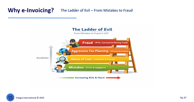 The so‑called “ladder of evil” illustrates the progression from unintentional mistakes to abuse of law, aggressive tax planning, and ultimately organised fraud. This conceptual model reflects EU tax enforcement theory, where compliance risks evolve in complexity and structure. ViDA’s digital reporting architecture addresses this by enabling pattern recognition, transaction linking, and behavioural analytics, which are not possible in periodic reporting systems.