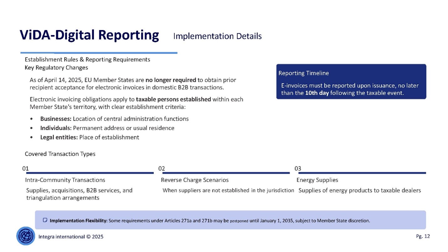 ViDA abolishes the requirement for recipient consent for B2B electronic invoicing and introduces establishment‑based obligations. Taxable persons established within a Member State are subject to mandatory digital reporting obligations. The Digital Reporting Requirements established under ViDA impose transaction-level reporting obligations that fundamentally alter VAT compliance dynamics. E-invoices must be reported upon issuance and no later than the tenth day following the taxable event, thereby eliminating the temporal distance between economic activity and fiscal visibility. The scope of reporting includes intra-Community supplies and acquisitions, B2B services, triangulation transactions, reverse charge scenarios involving non-established suppliers and specific energy sector supplies. These reporting obligations create a continuous data flow from economic operators to tax administrations, enabling near real-time cross-border validation and automated risk analysis. Articles 271a and 271b of the Directive allow limited postponement options for certain obligations until 2035.