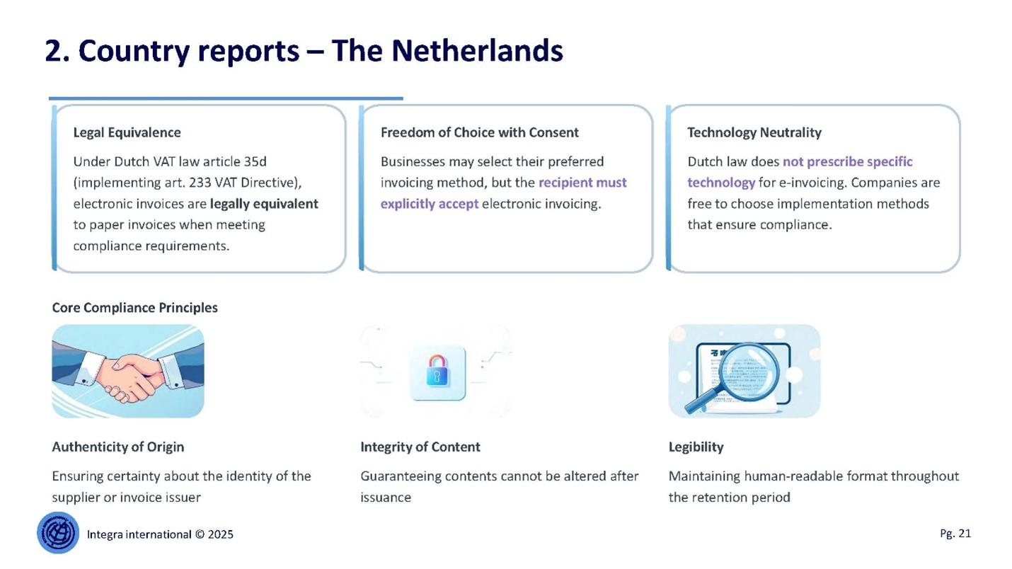 Dutch law also embodies the principle of technology neutrality, allowing taxable persons to choose any technical solution that ensures compliance with these core principles. Historically, electronic invoicing in the Netherlands has therefore been based on voluntary adoption and contractual consent models.